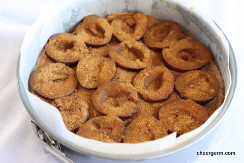 Spread the batter into the prepared cake tin and gently press the plum halves, cut-side up into the batter.