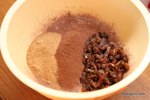 Sift the cocoa powder, gluten free and buckwheat flours, baking powder and xanthum gum into a large mixing bowl.