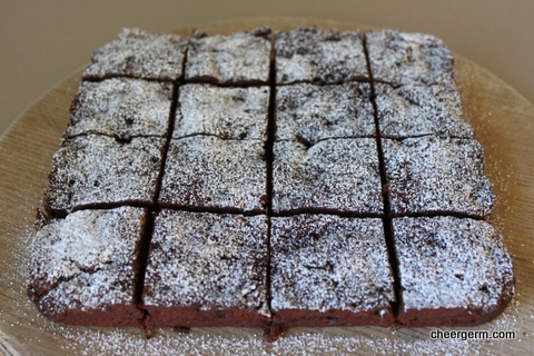 Cool in the tin before cutting into squares. Dust with icing sugar (or don’t). (I did).