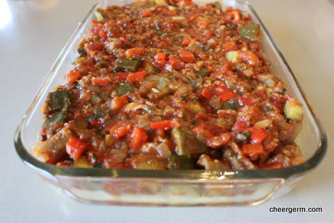 Pour the tomato vegetable sauce over the polenta and top with the mozarella.