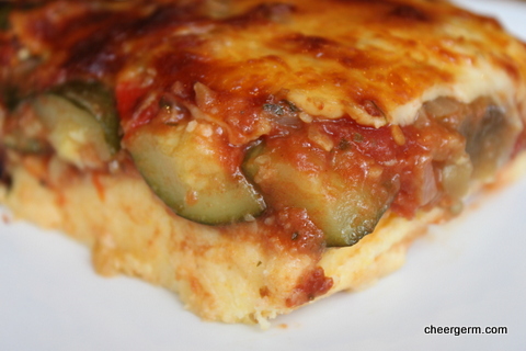 Pour the tomato vegetable sauce over the polenta and top with the mozarella.