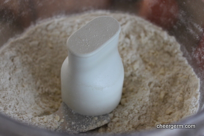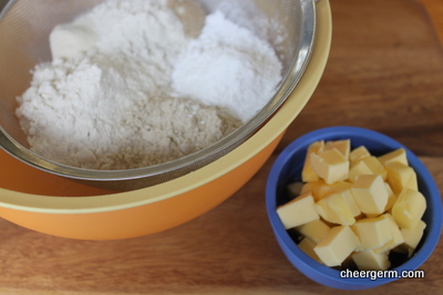 Put all the dry ingredients into a food processor and pulse briefly to combine them. Drop in the butter and process just until the mixture forms fine crumbs. (You can do this all by hand, rubbing the butter into the flour but machine mixing is easier!)