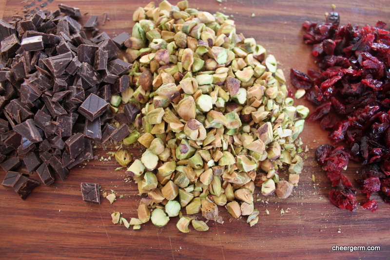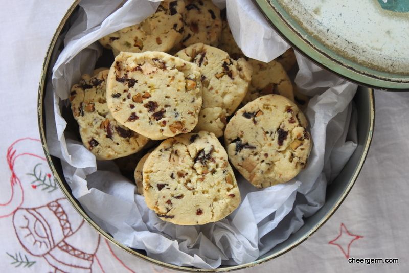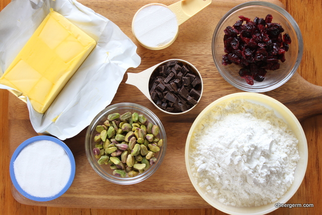 I blathered on about what shortbread means to me last year. In short, Christmas is shortbread and shortbread is Christmas. Up to today, this Cheergerm has baked good old fashioned shortbread, gluten free shortbread and chocolate ginger shortbread. (Hmm, I see a pattern.) Now I present to you a very grown up chocolate, pistachio and cranberry shortbread.