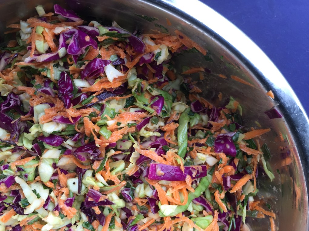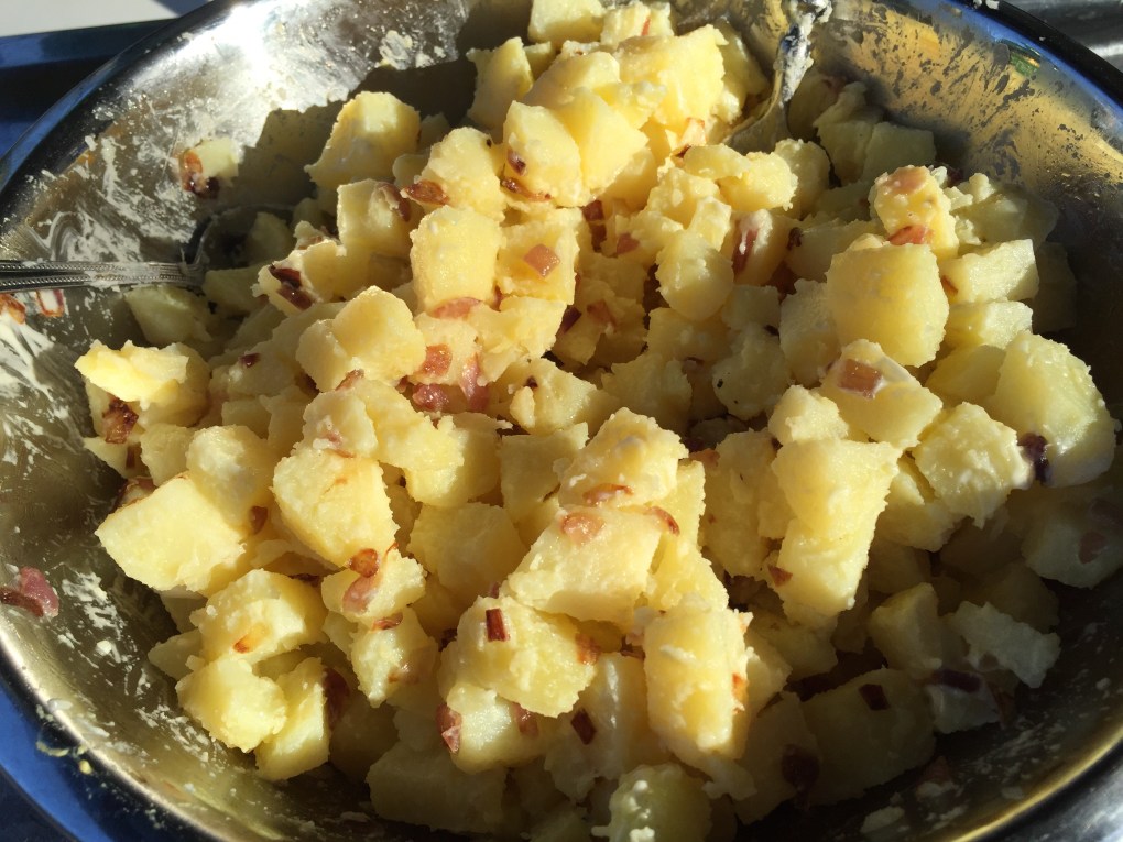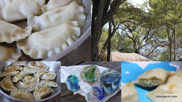 R had also rustled up two different kinds of pierogi. (Yes, two, people. She doesn’t do things by halves and vegetarians by halves.) Pierogi are wee dumplings made of unleavened dough that are first boiled then pan fried and in this case, served with buttery fried onions on top. There was the vegetarian pierogi filled with cheese, potato and onion and the kolduny litewskie meat version with lamb mince, onion, peppers, garlic and marjoram. A fight almost broke out when divvying up the leftovers. I missed out. Just saying.