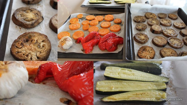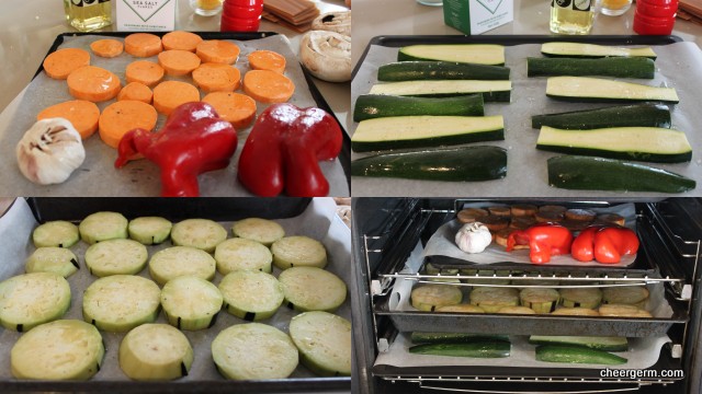Cut the eggplants (I peel mine), sweet potato (peeled) and zucchini into one cm thicknesses. Place on trays lined with baking paper, oil both sides of the vegetables and season with salt and pepper lightly.