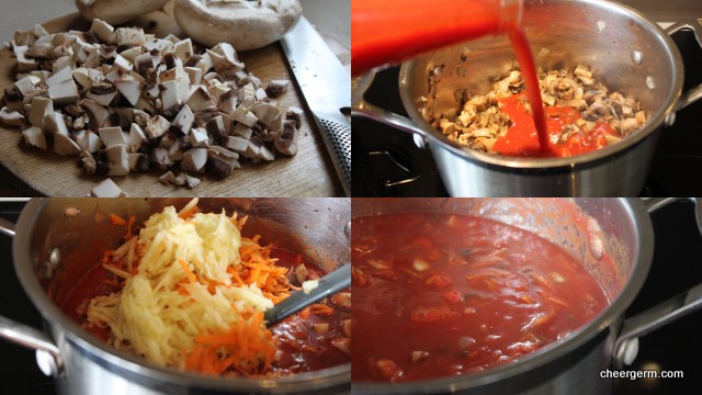 Add the sugo, tin of tomatoes, grated apple and carrot. Season with 1 tsp salt and some generous grinds of black pepper.