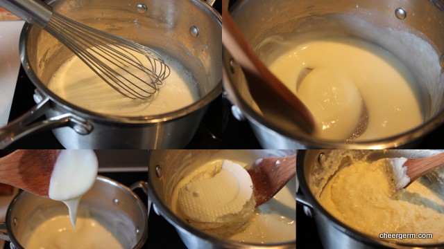 Put the sauce back on the heat and stir constantly with a wooden spoon until the mixture starts to thicken. Cook the white sauce for a few minutes, continuing to stir constantly.