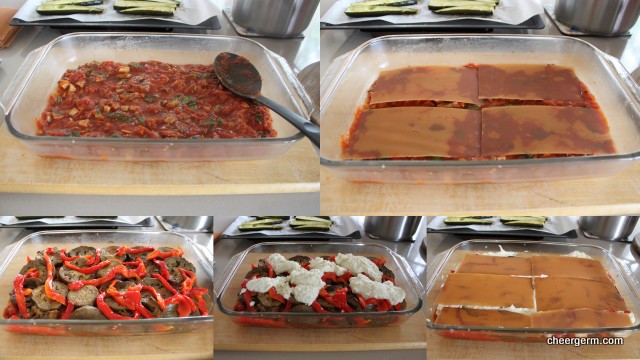 Put all the eggplant in a single layer, place the red pepper strips on top then layer on half of the ricotta sauce. Smooth it out.