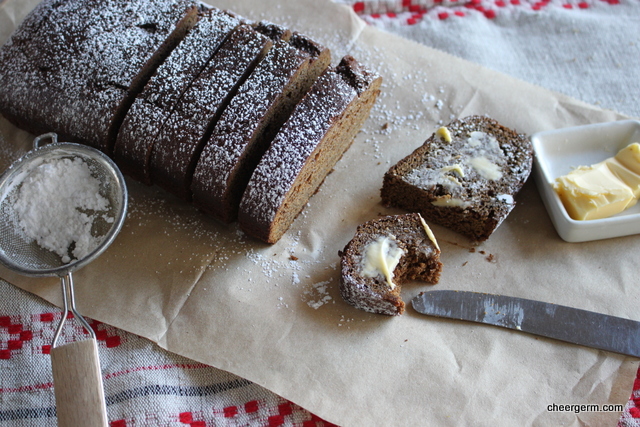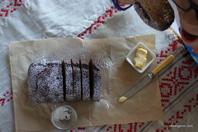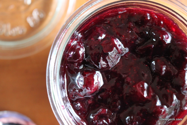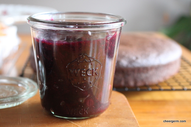 With a few fresh blueberries left and some good quality (as in they won’t poison anyone) frozen ones in the freezer, the idea of a blueberry sauce popped into my mind. A recipe was found, a few adjustments made and Bob was my uncle. Sweet, tart and wonderfully gloopy, this fruit sauce was the perfect accompaniment to the rich, dark cake. We ate the leftovers as jam.