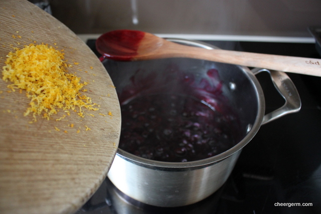 Add the cornflour (that has been dissolved in water) to the saucepan slowly. Be careful not to squish the blueberries.