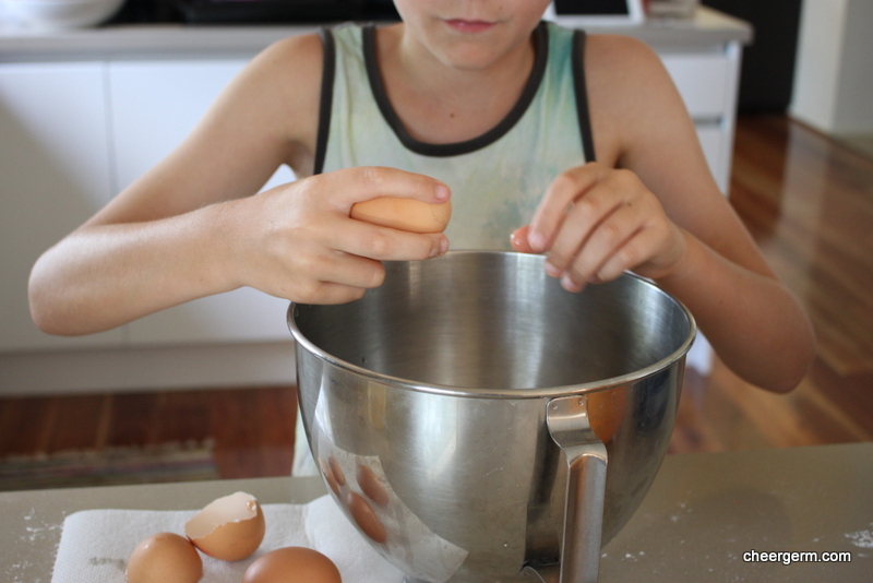 Kid 1 was a keen apprentice, cracking eggs and jokes like the best of them. The sponge rose to the heavens and all was well with the world. Due to the days increasing heat, we decided to cool the cake downstairs. It was proudly placed on a chest of drawers near the stairs, which seemed like a good idea at the time. Half an hour went by and off I trotted to check the cake. The once magnificent, feather light sponge now had huge chunks missing from the side and there was a Hansel and Gretel trail of crumbs around the base of the stairs. Roaring in dismay, I looked up to see our dogger Elvis, standing there, guilty crumbs still attached to his fluffy bearded face. He had cleverly managed to squish his doggy snout in between the stair banisters and reach the cake.
