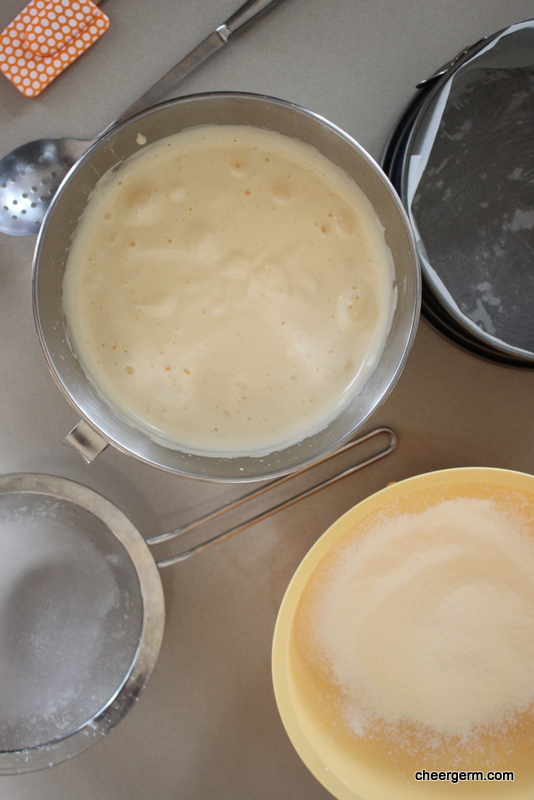 In a large bowl, using a mixer (I used my stand mixer) beat the eggs until frothy. Gradually add the sugar until the mixture is pale, creamy and thick and holds its shape. This process can take up to ten minutes. (Which is why a stand mixer is handy.)