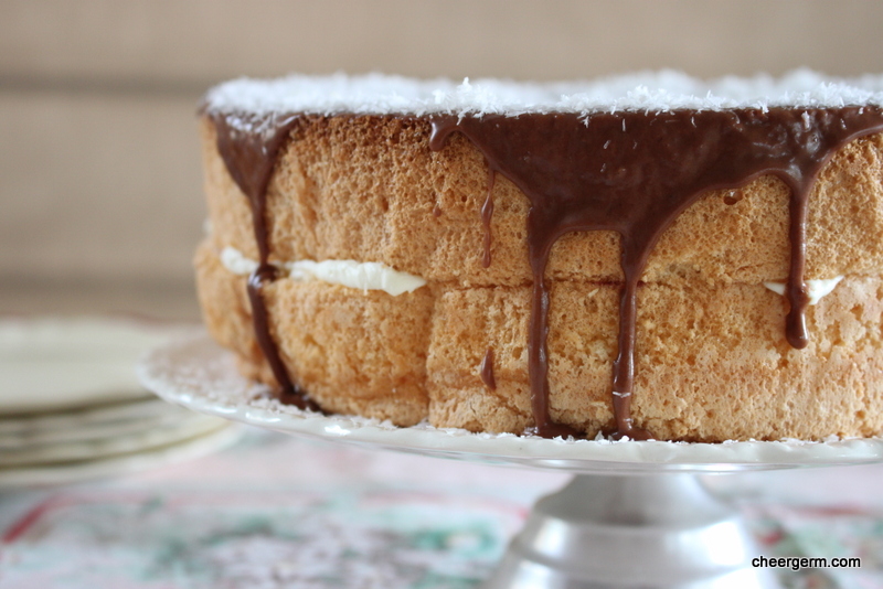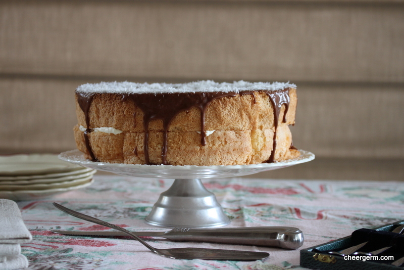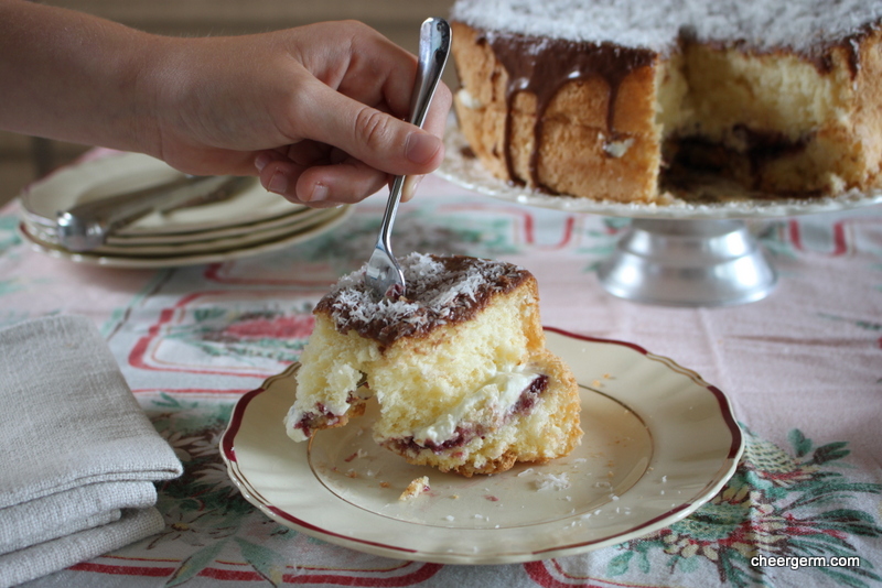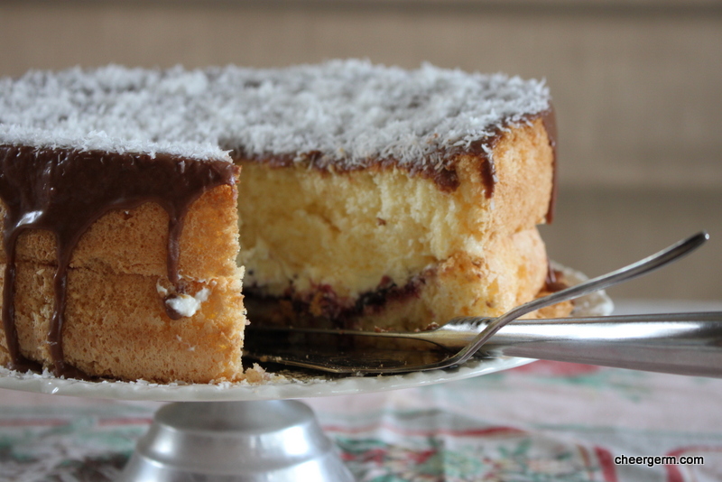 So, yes, the dog ate my homework. No photos were taken of this once glorious behemoth on that day. (Well, except for one iPhone photo.) We cut off the dog slobbered upon portions, sliced it and added jam, cream, the icing and coconut. It was still delicious, if only half the cake it should have been.