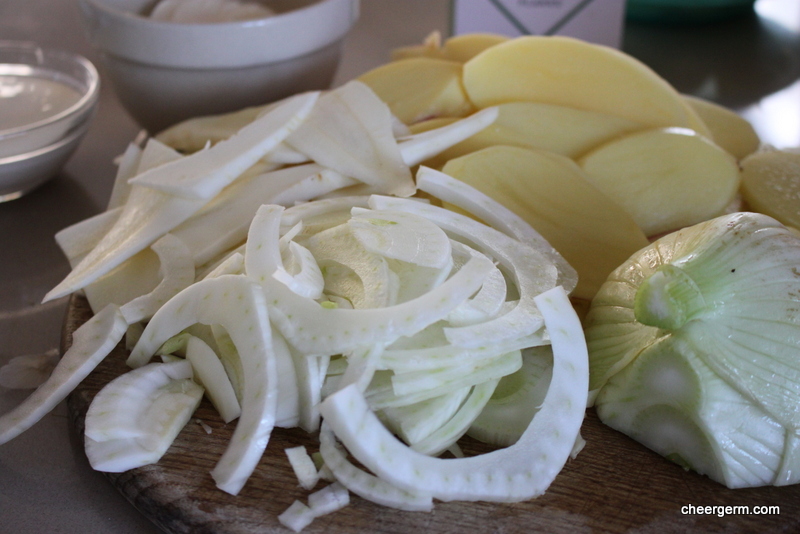 Layer the potato, parsnip, fennel and season with salt and pepper then sprinkle on half of the cheese. (Leaving enough cheese to sprinkle on the top.)